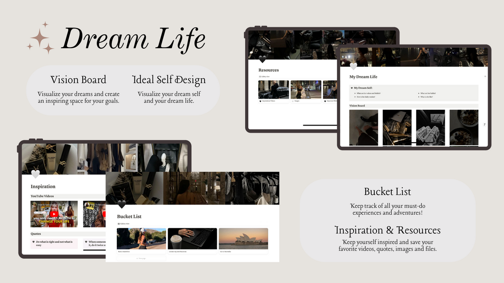 - Creative Spaces: Vision board, bucket list, year in photos, and brain dump for your ideas.