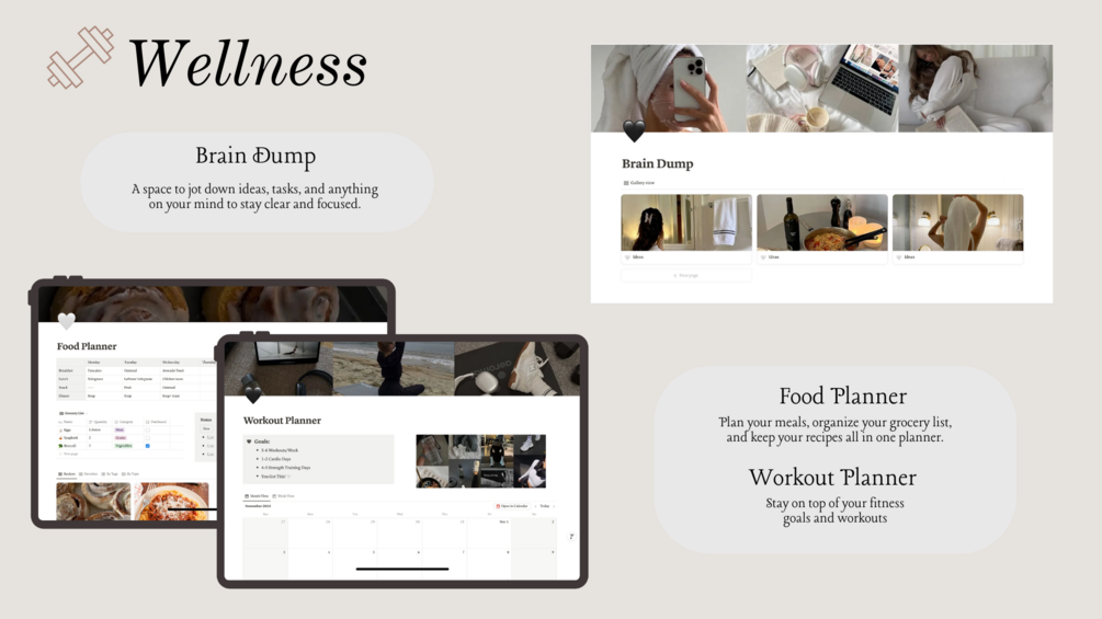 - Planners: Daily, weekly, and monthly planning spaces to stay on top of your tasks.