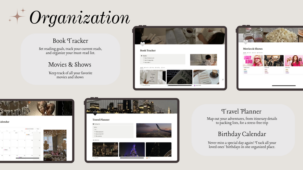- Dedicated Organizers: Book tracker, travel planner, food planner, workout planner, movies & shows log, and a birthday calendar.