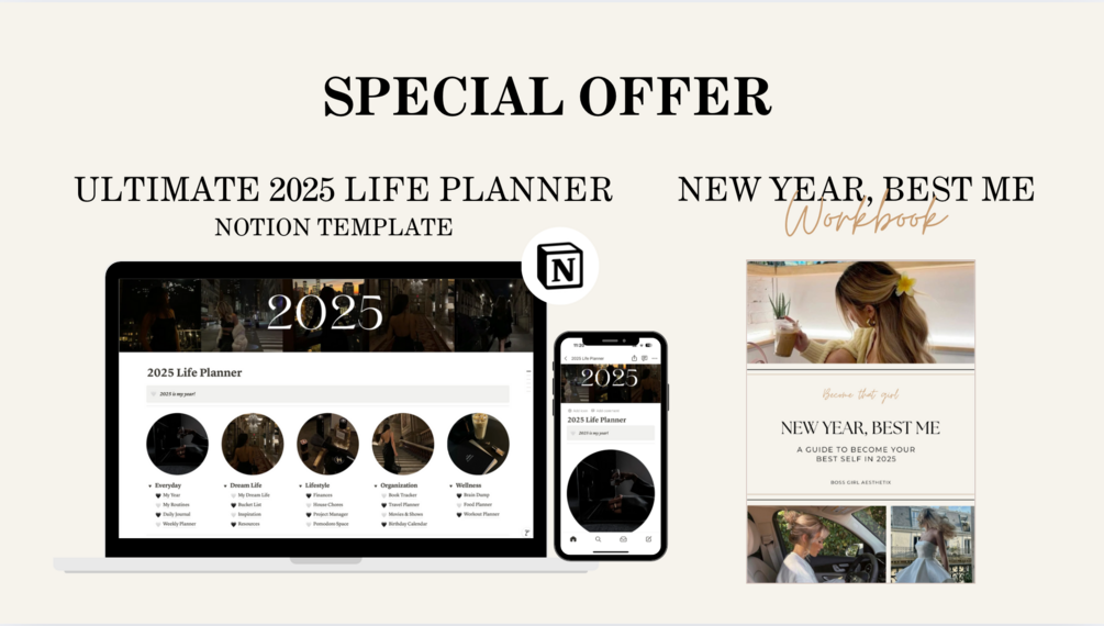 You'll receive the New Year, Best Me Workbook & the Ultimate 2025 Life Planner Notion Template